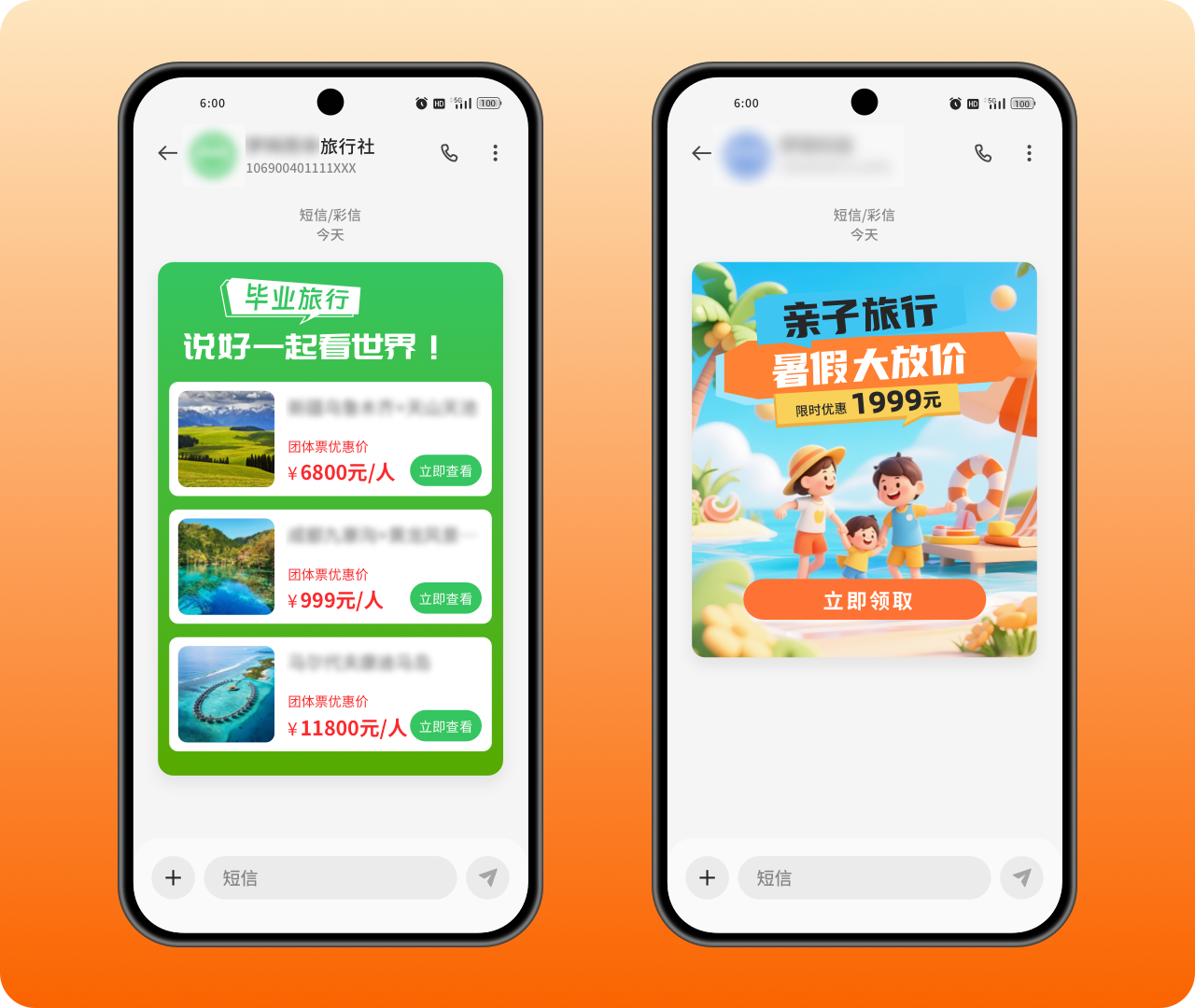 凭借K8凯发科技5G阅信的个性化触达功能,品牌商家能够根据用户的兴趣、行为和偏好,实现不同群体的精准信息推送。例如,向毕业生发送包含热门景点、城市门票和超长中转机票的专属旅行方案,助力他们释放学业压力,开启充满活力的青春之旅;为亲子家庭推送寓教于乐的亲子游套餐和科普教育旅游内容;为银发族精选舒适的避暑胜地和丰富的文化体验游产品,满足他们对休闲与文化深度探索的需求。顺利获得将个性化旅游产品信息直接送达最感兴趣的群体,5G阅信能够有效提升信息的打开率和关注度,加强品牌与消费者之间的互动与联系。