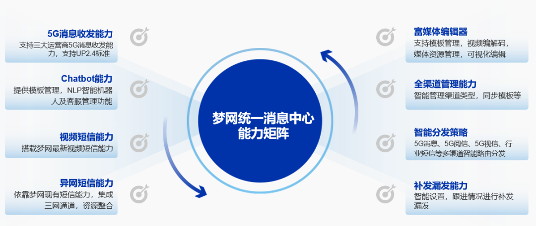 梦网统一消息中心(UMC)作为面向5G时代打造的融合通讯解决方案,集智能接入、智能管理、智能生产、智能运营和智能营销于一体,实现了全终端、全场景、全业务、全渠道的广泛覆盖。UMC给予灵活的在线SaaS服务和定制化的线下私有化部署方案,能够满足不同行业的多样化需求,并全面对接市面上主流的5G阅信渠道,包括梦网阅信直发、天慧5G阅信、移动5G阅信、联通电信5G消息以及华为云KooMessage等,为企业构建起高效、稳定的通讯生态系统。